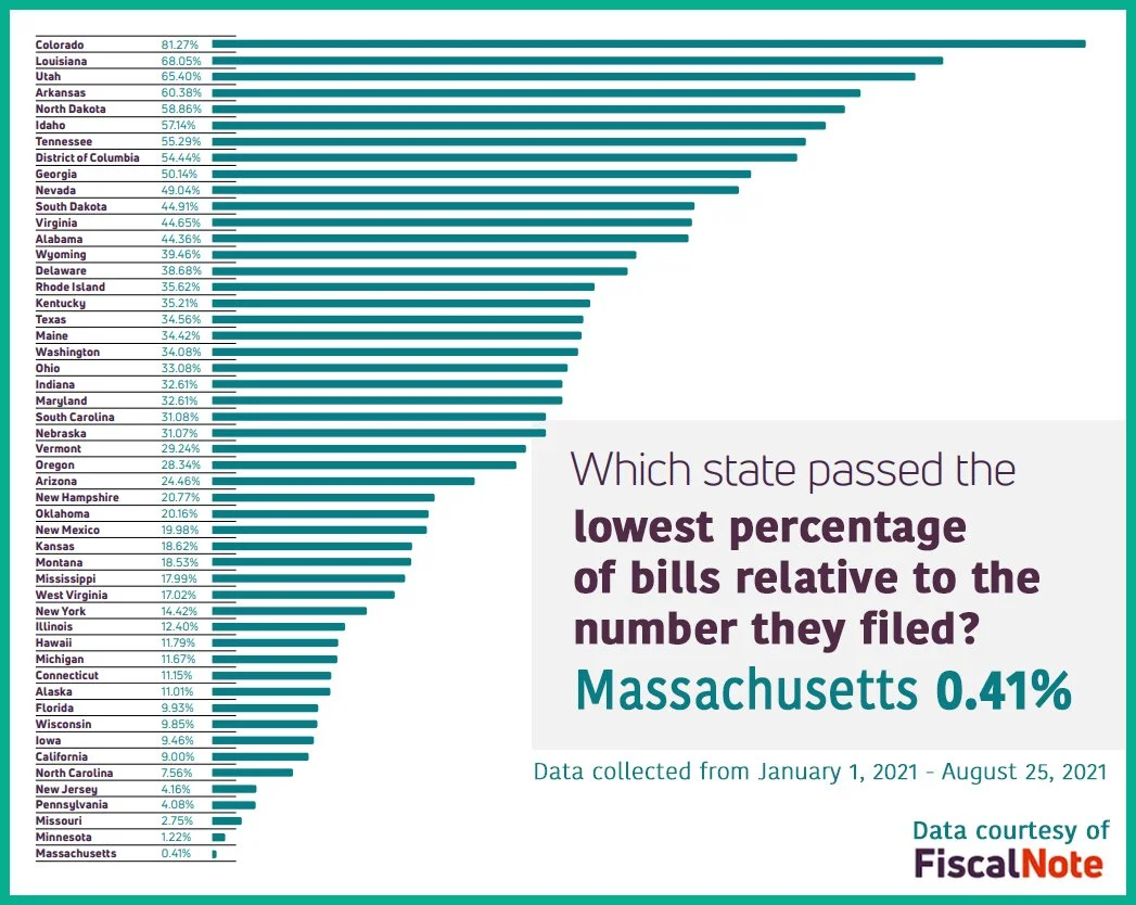 According to studies by national legislative services Quorum and FiscalNote, Massachusetts leads the nation in the number of bills filed, yet we come in last in terms of the percentage enacted.