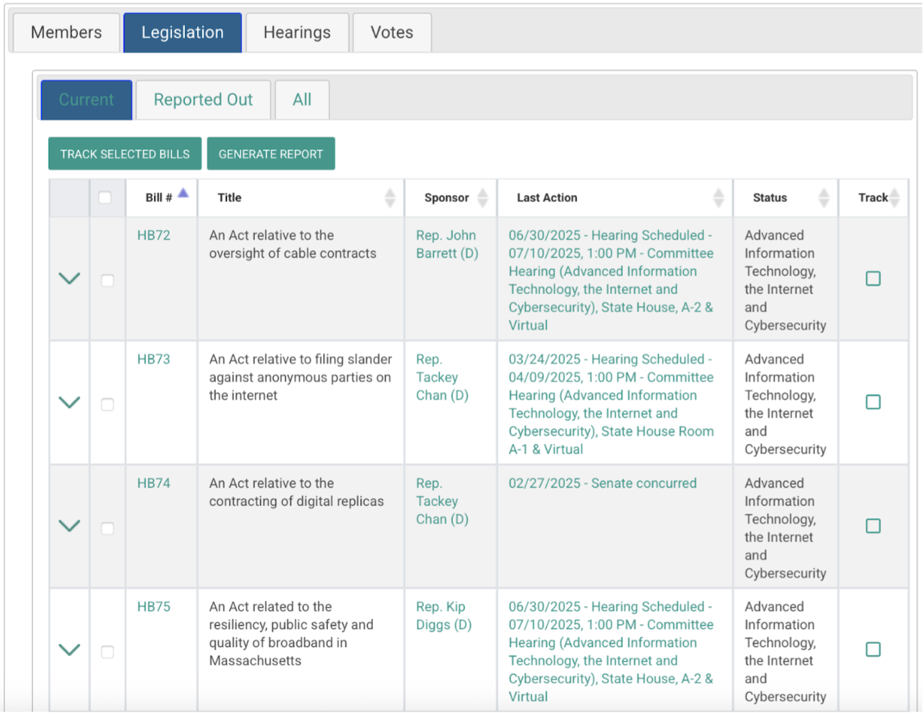 Generate reports and track individual bills within the committee.