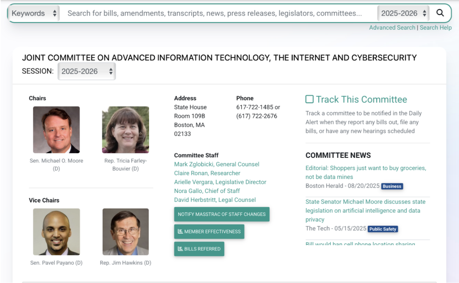 Need to get in touch quickly? Committee pages let you email all members at once or call offices directly with listed phone numbers. Whether it’s scheduling testimony or sharing your perspective on a bill, MassTrac eliminates the friction.