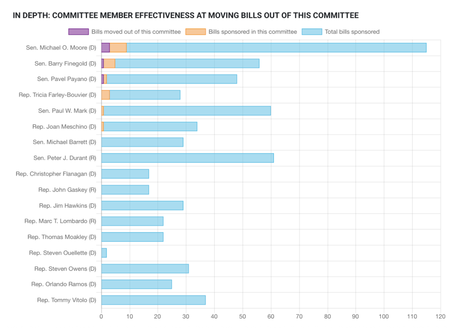 Member Effectiveness: Which legislators move the most bills out of committee, and who sponsors the most bills overall.